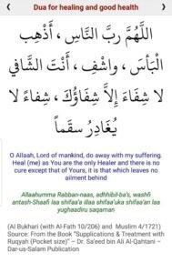 Ibn ‘Uthaymin sade om denna du’a: ”Och i denna Hadith finns det bevis att man bör läsa detta i samband med Ruqyah på denna sjuke. (Sharh Riyadh as-salihin 4/485)